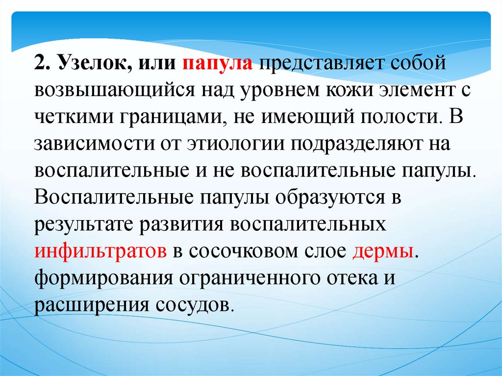 23. Пузырек (везикула) – полостное образование в эпидермисе, содержит серозную или серозно-геморрагическую жидкость до 5 мм