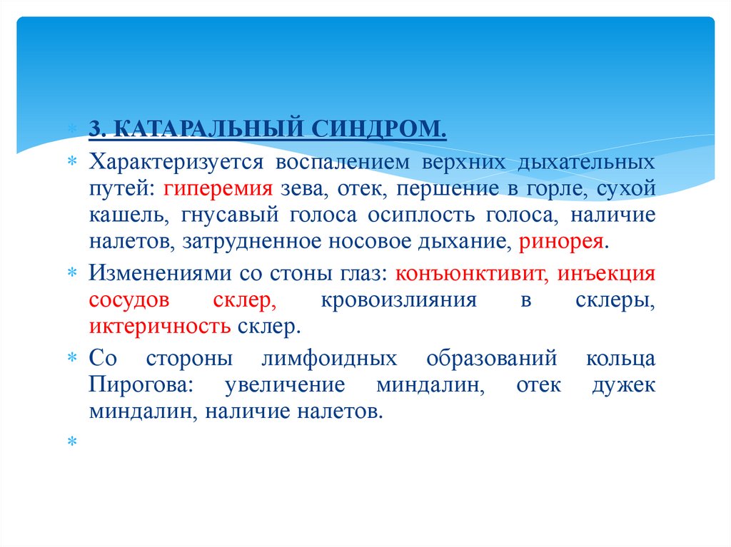 3. КАТАРАЛЬНЫЙ СИНДРОМ.Характеризуется воспалением верхних дыхательных