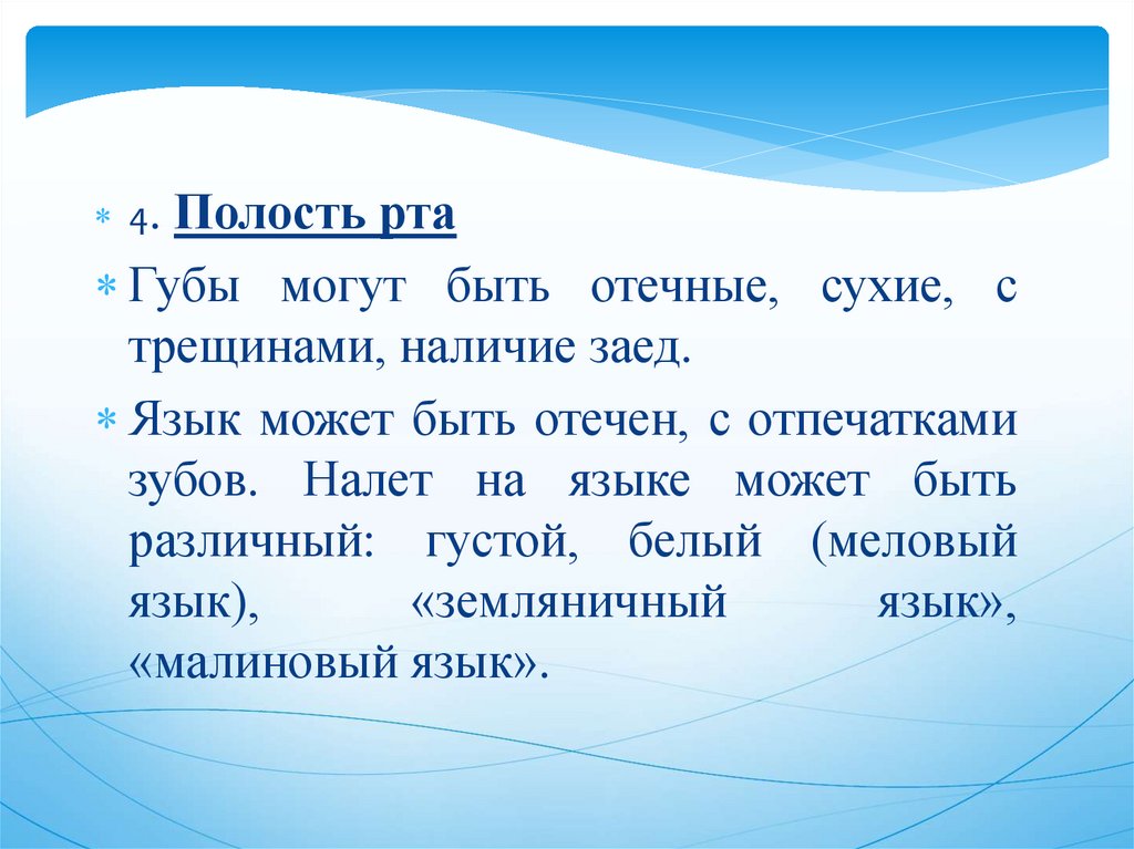 4. Полость ртаГубы могут быть отечные, сухие, с
