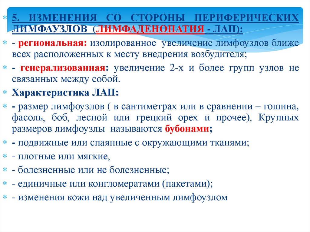 5. ИЗМЕНЕНИЯ СО СТОРОНЫ ПЕРИФЕРИЧЕСКИХЛИМФАУЗЛОВ (ЛИМФАДЕНОПАТИЯ - ЛАП):