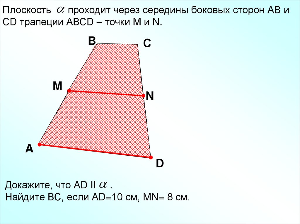 Плоскость проходит через середины боковых сторон АВ иСD трапеции АВСD – точки М и N.