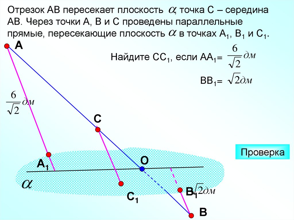 Отрезок АВ пересекает плоскость , точка С – серединаАВ. Через точки А, В и С проведены параллельные