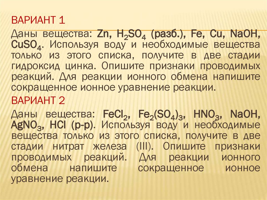ВАРИАНТ 1Даны вещества: Zn, H2SO4 (разб.), Fe, Сu, NaOH,