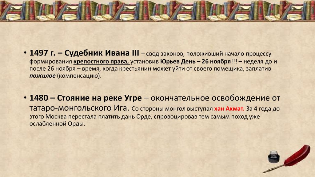 • 1497 г. – Судебник Ивана III – свод законов, положивший начало процессуформирования крепостного права, установив Юрьев День – 26 ноября!!! – неделя до и