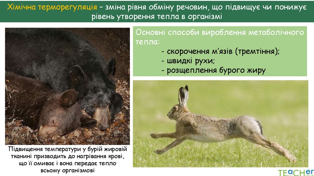 Хімічна терморегуляція – зміна рівня обміну речовин, що підвищує чи понижуєрівень утворення тепла в організмі