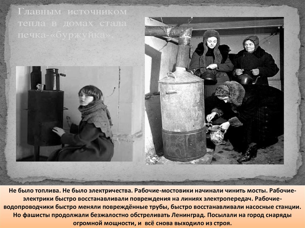 Не было топлива. Не было электричества. Рабочие-мостовики начинали чинить мосты. Рабочиеэлектрики быстро восстанавливали повреждения на линиях электропередач. Рабочиеводопроводчики быстро меняли повреждённые трубы, быстро восстанавливали насосные станции.Но фашисты продолжали безжалостно обстреливать Ленинград. Посылали на город снаряды