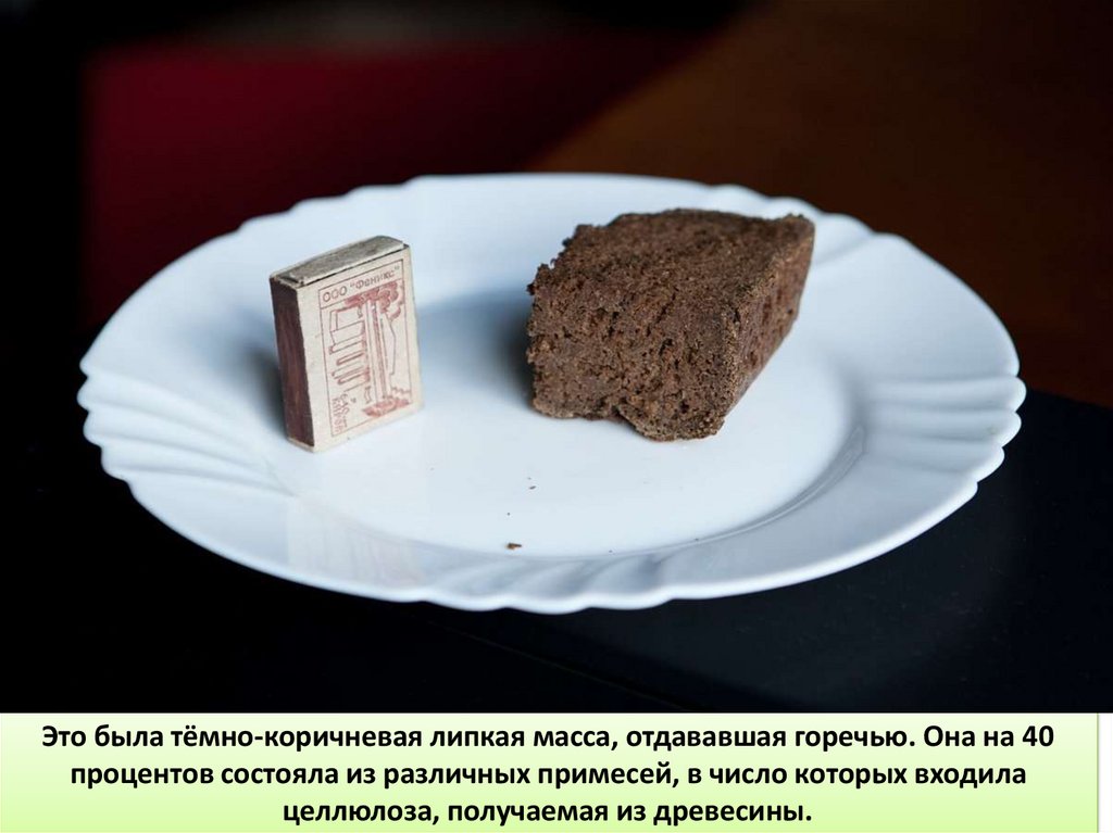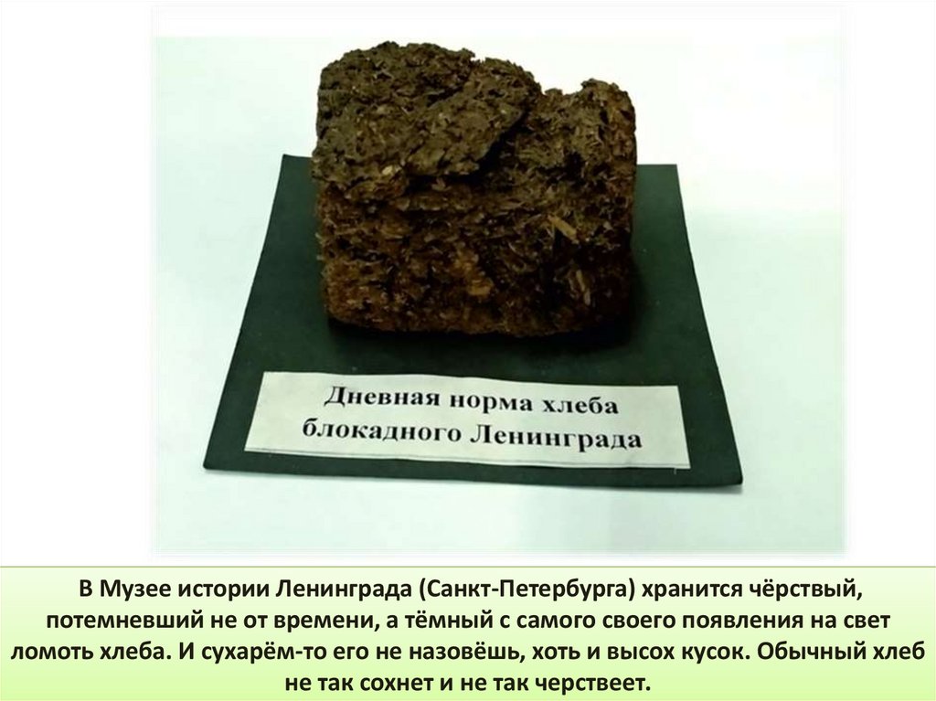 В Музее истории Ленинграда (Санкт-Петербурга) хранится чёрствый,потемневший не от времени, а тёмный с самого своего появления на свет