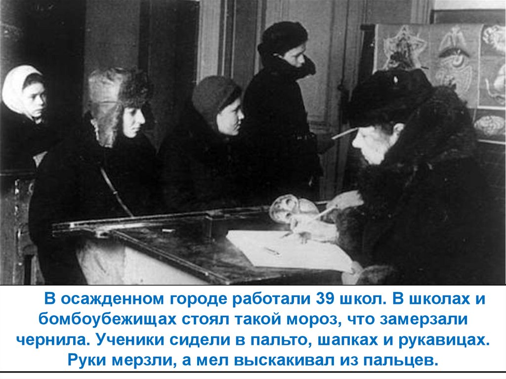 В осажденном городе работали 39 школ. В школах ибомбоубежищах стоял такой мороз, что замерзали