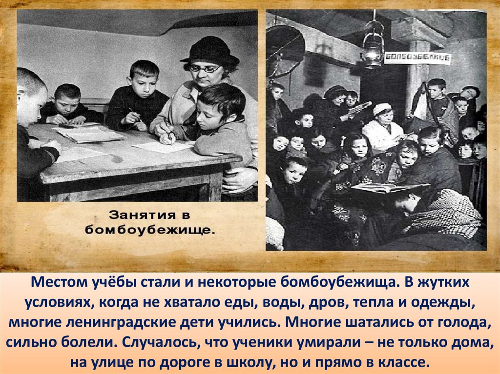 Местом учёбы стали и некоторые бомбоубежища. В жуткихусловиях, когда не хватало еды, воды, дров, тепла и одежды,