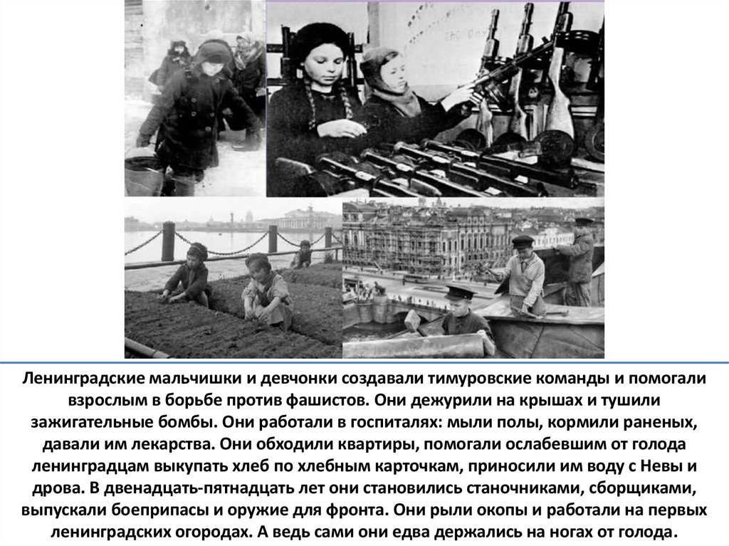Ленинградские мальчишки и девчонки создавали тимуровские команды и помогаливзрослым в борьбе против фашистов. Они дежурили на крышах и тушили