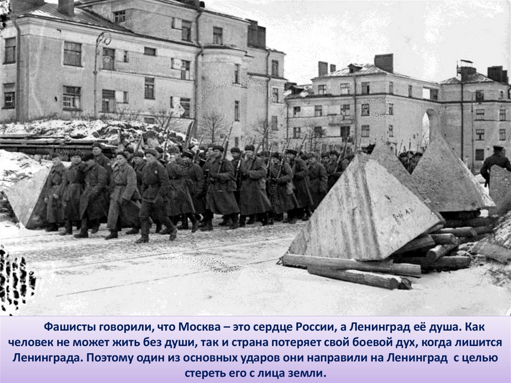 Фашисты говорили, что Москва – это сердце России, а Ленинград её душа. Какчеловек не может жить без души, так и страна потеряет свой боевой дух, когда лишится