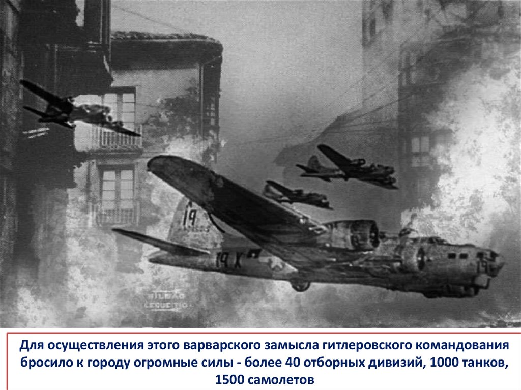 Для осуществления этого варварского замысла гитлеровского командованиябросило к городу огромные силы - более 40 отборных дивизий, 1000 танков,
