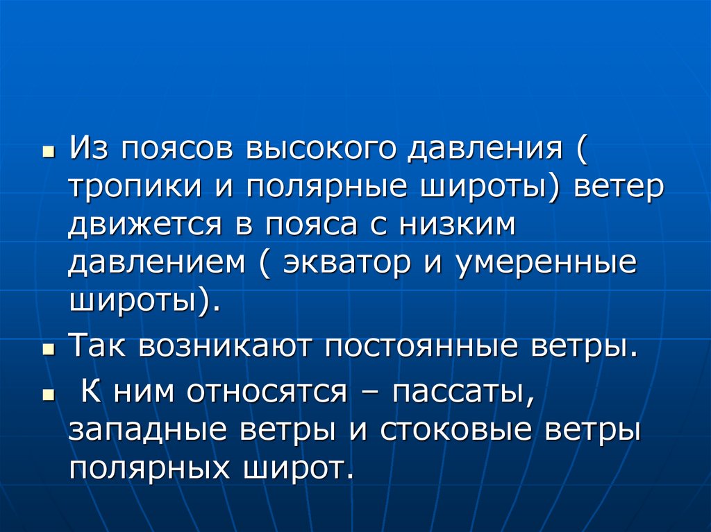 Из поясов высокого давления (тропики и полярные широты) ветер