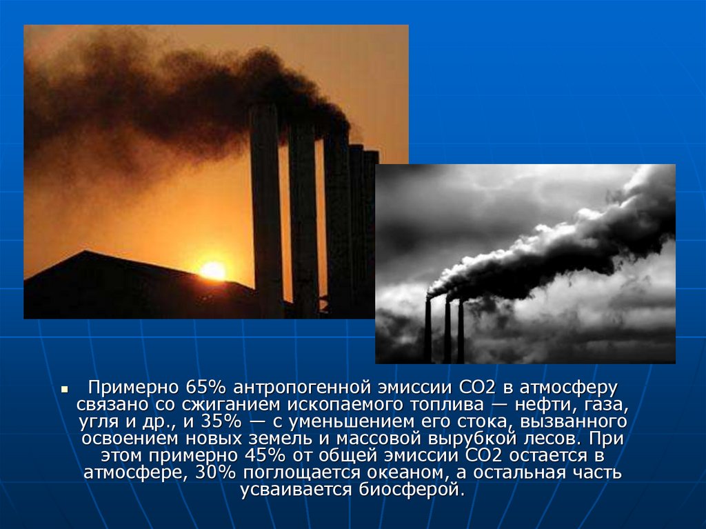 Примерно 65% антропогенной эмиссии СО2 в атмосферусвязано со сжиганием ископаемого топлива — нефти, газа,