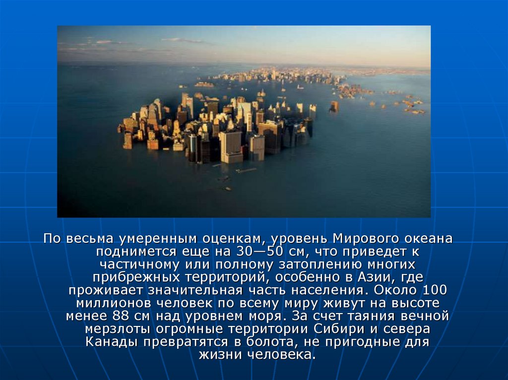 По весьма умеренным оценкам, уровень Мирового океанаподнимется еще на 30—50 см, что приведет к