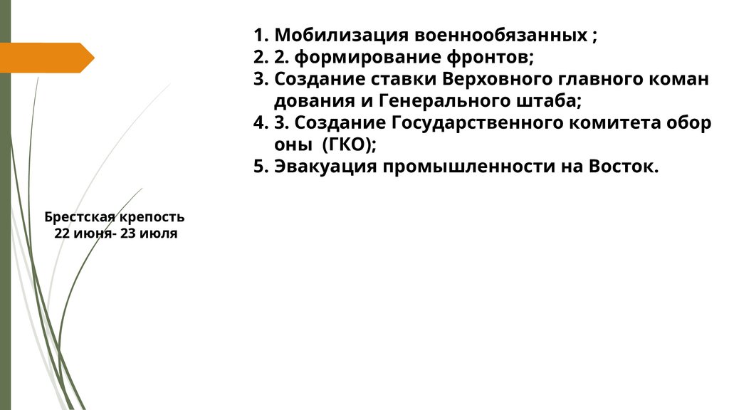 1. Мобилизация военнообязанных ;2. 2. формирование фронтов;