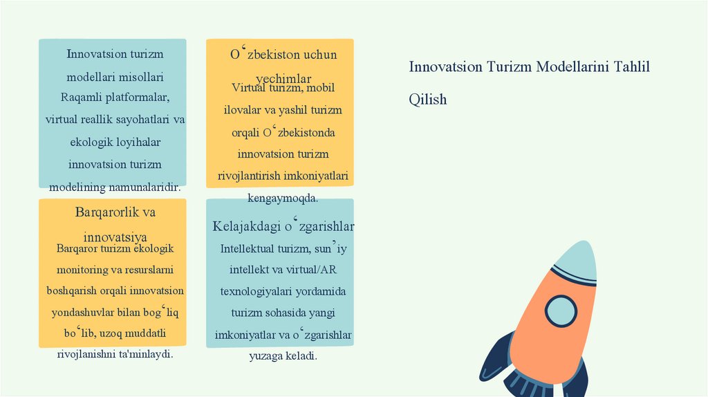 5. Yuldashev, B. (2022). O'zbekistonda turizmni rivojlantirish uchun innovatsion