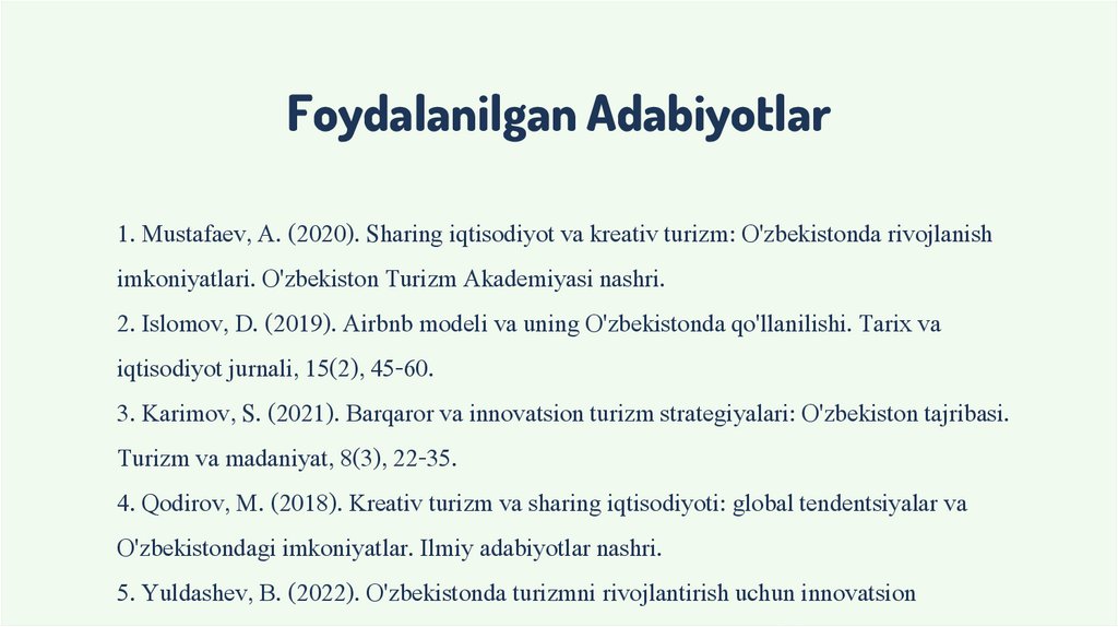 Foydalanilgan Adabiyotlar1. Mustafaev, A. (2020). Sharing iqtisodiyot va kreativ turizm: O'zbekistonda rivojlanish
