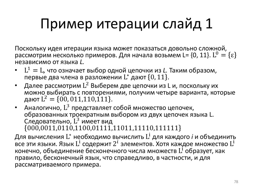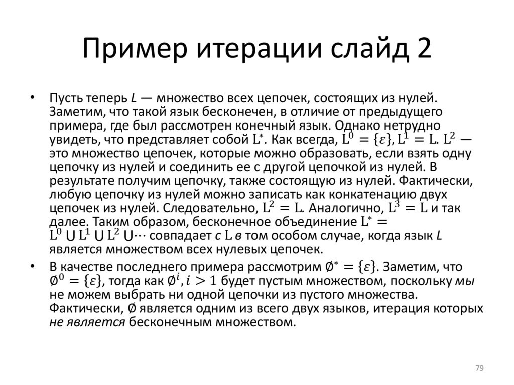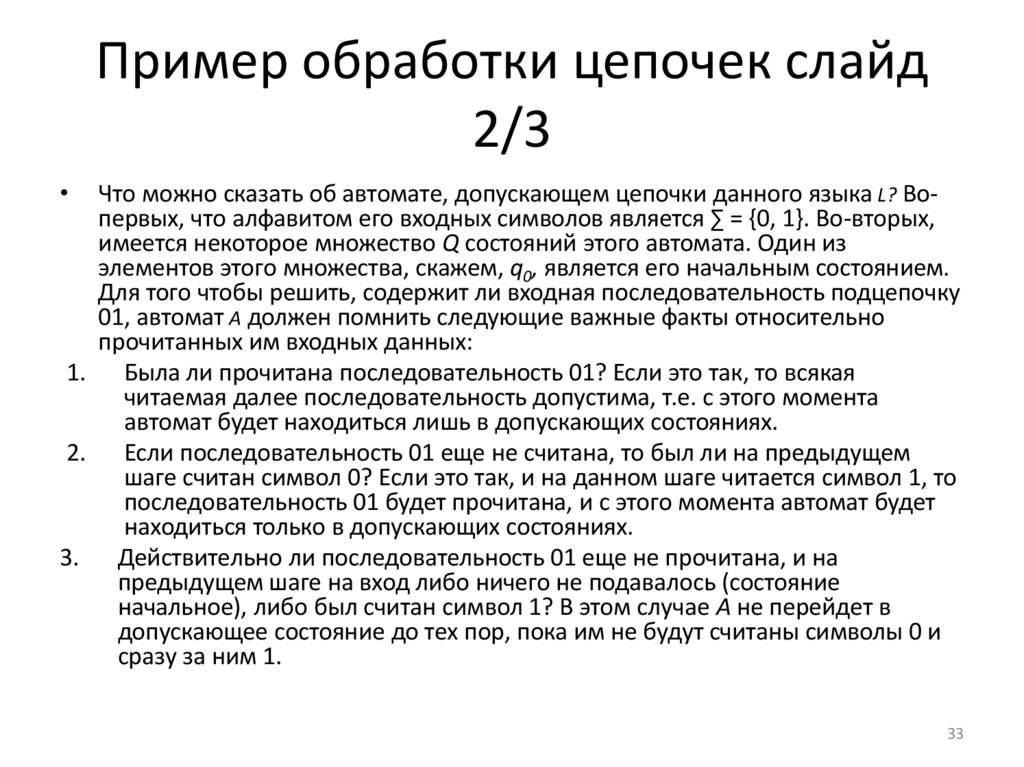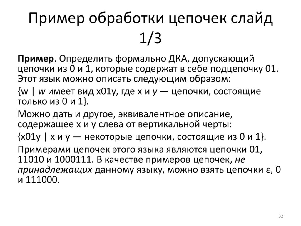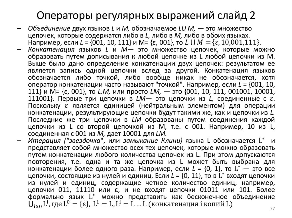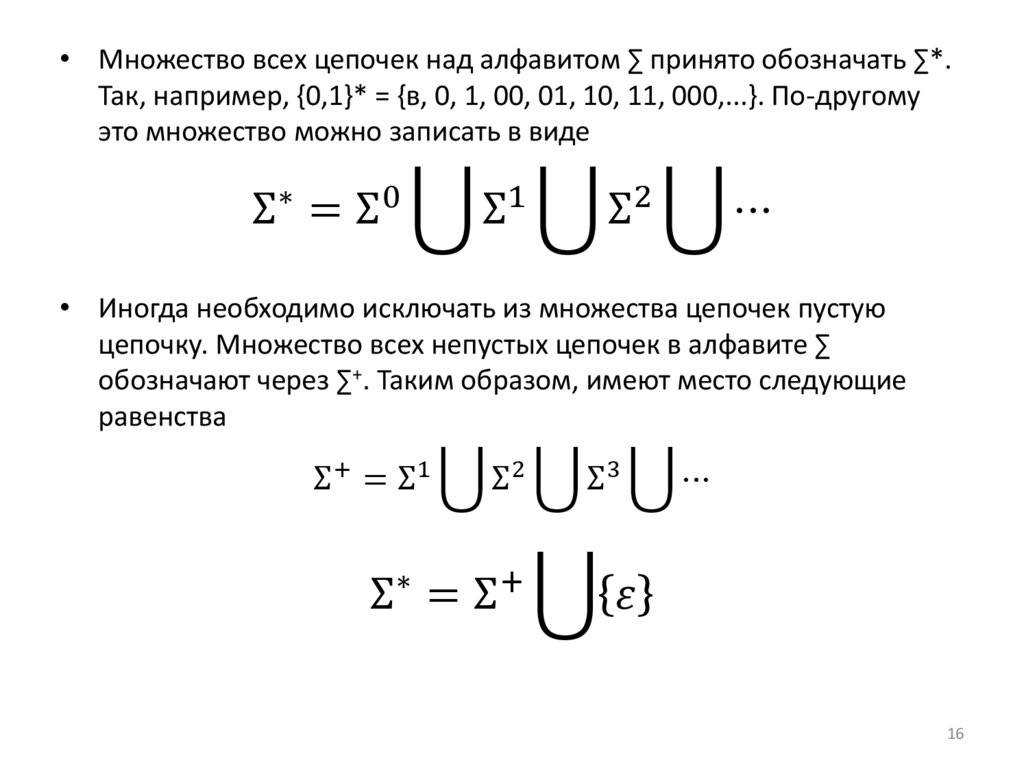 • Множество всех цепочек над алфавитом ∑ принято обозначать ∑*.Так, например, {0,1}* = {в, 0, 1, 00, 01, 10, 11, 000,...}. По-другому