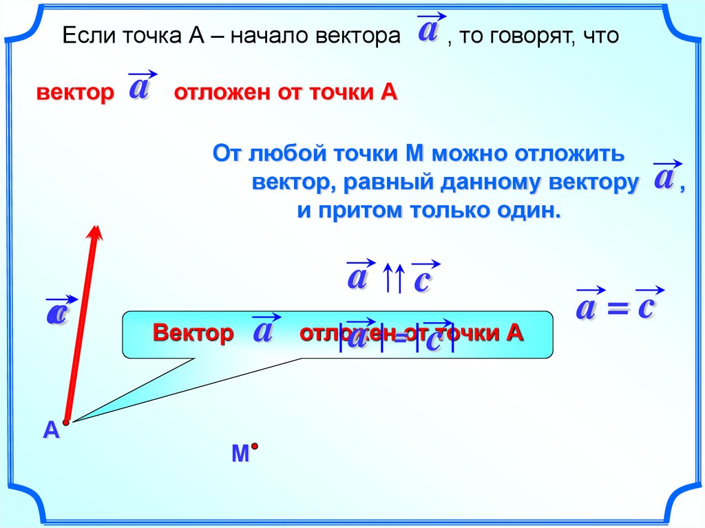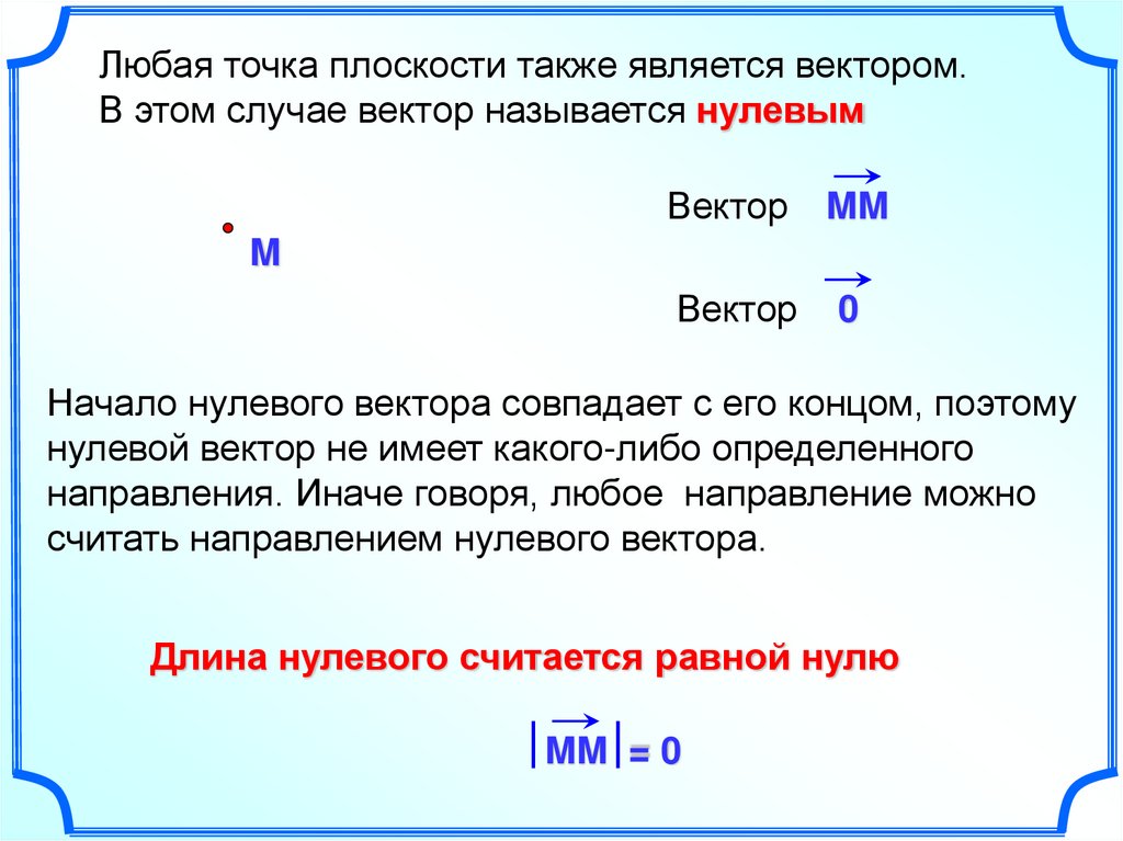 Любая точка плоскости также является вектором.В этом случае вектор называется нулевым