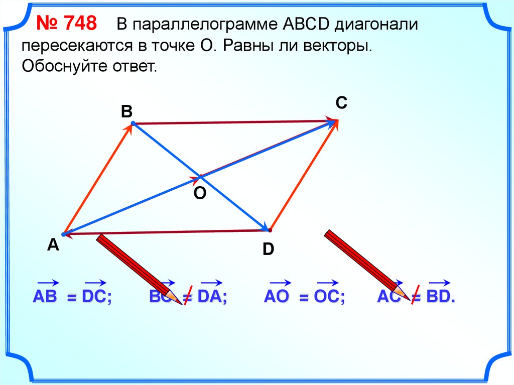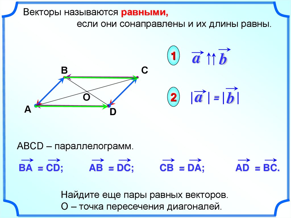 Векторы называются равными,если они сонаправлены и их длины равны.