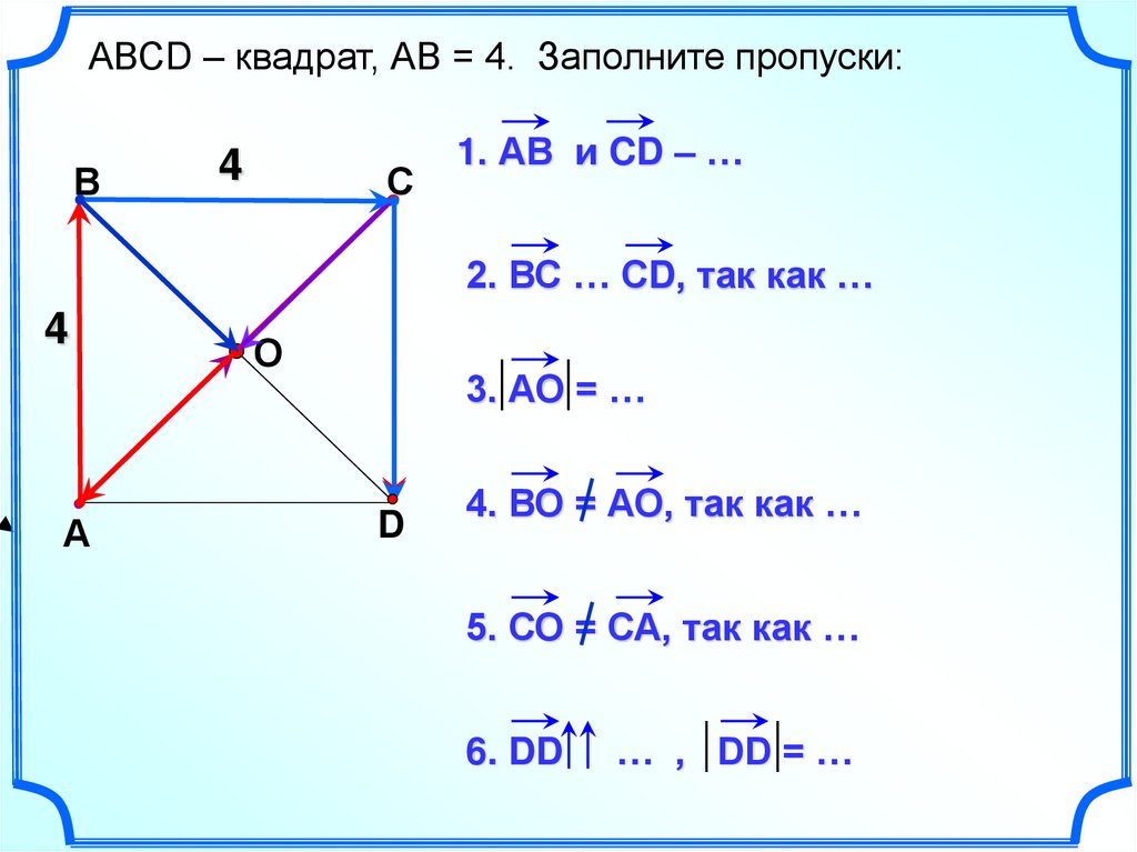 АВСD – квадрат, АВ = 4. Заполните пропуски:В