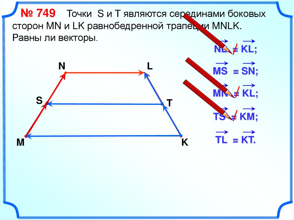 № 749 Точки S и Т являются серединами боковыхсторон MN и LK равнобедренной трапеции MNLK.