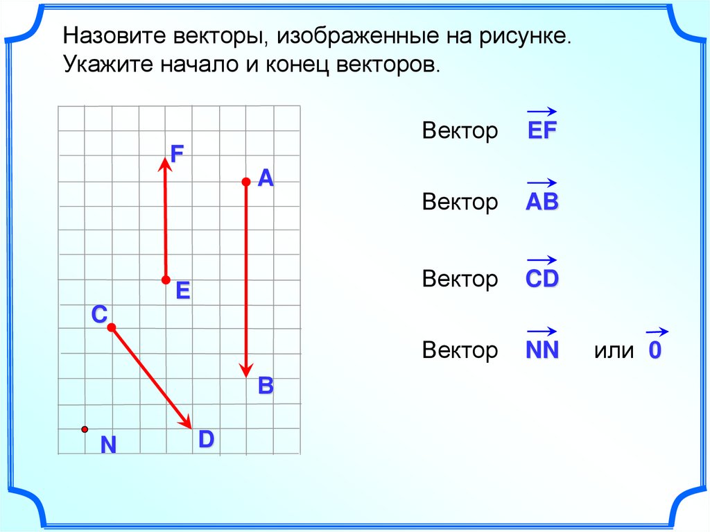 Назовите векторы, изображенные на рисунке.Укажите начало и конец векторов.