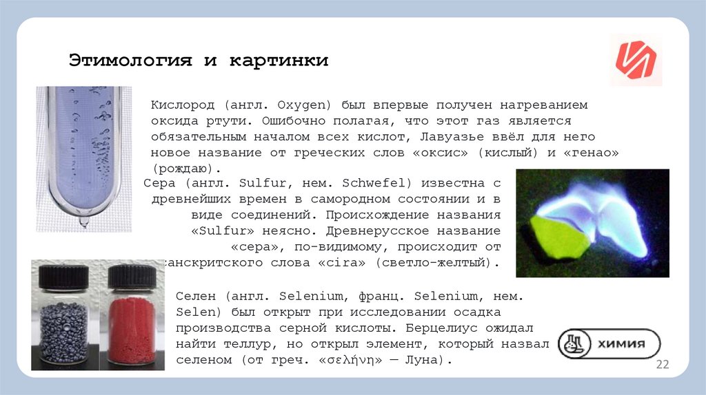 Этимология и картинкиКислород (англ. Oxygen) был впервые получен нагреванием