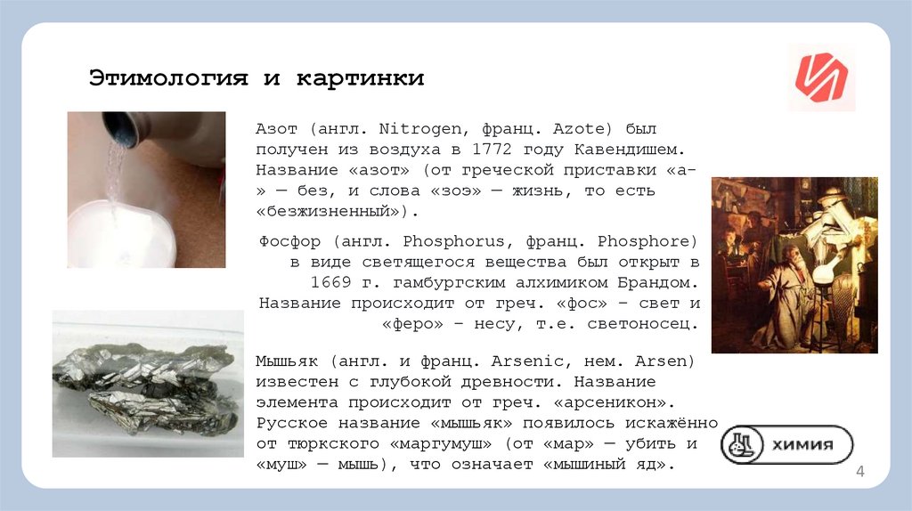 Этимология и картинкиАзот (англ. Nitrogen, франц. Azote) был