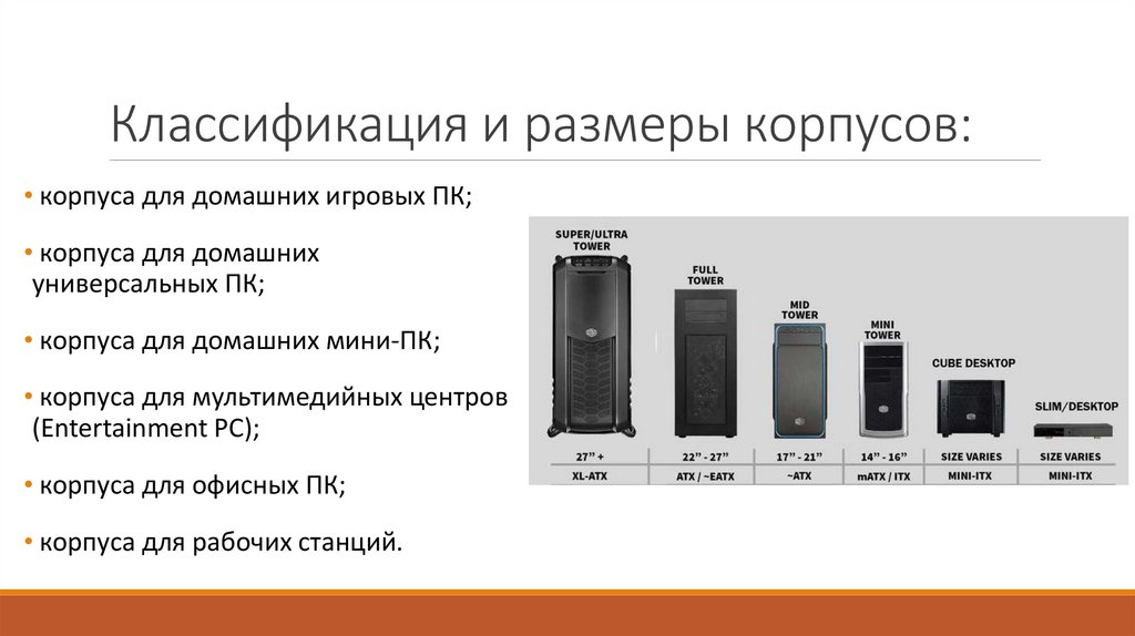 Классификация и размеры корпусов:• корпуса для домашних игровых ПК;