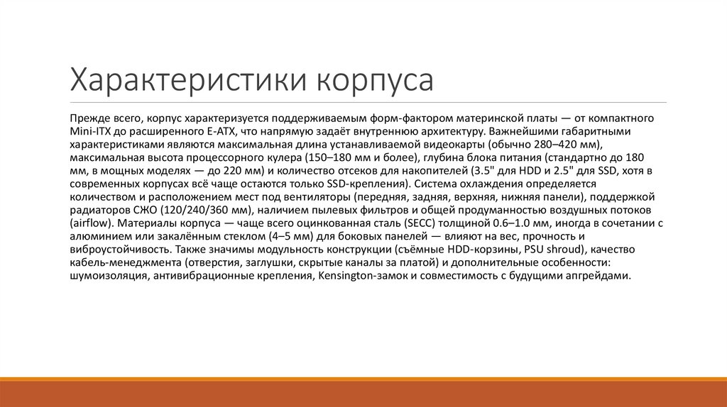 Характеристики корпусаПрежде всего, корпус характеризуется поддерживаемым форм-фактором материнской платы — от компактного