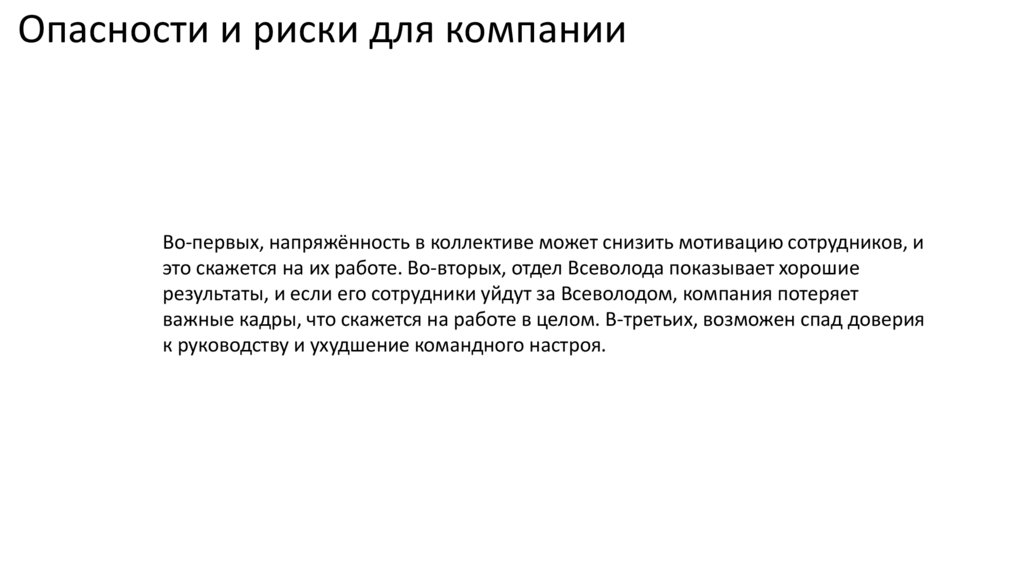 Опасности и риски для компанииВо-первых, напряжённость в коллективе может снизить мотивацию сотрудников, и