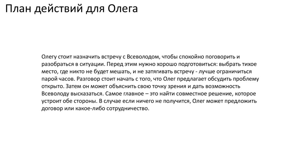 План действий для ОлегаОлегу стоит назначить встречу с Всеволодом, чтобы спокойно поговорить и