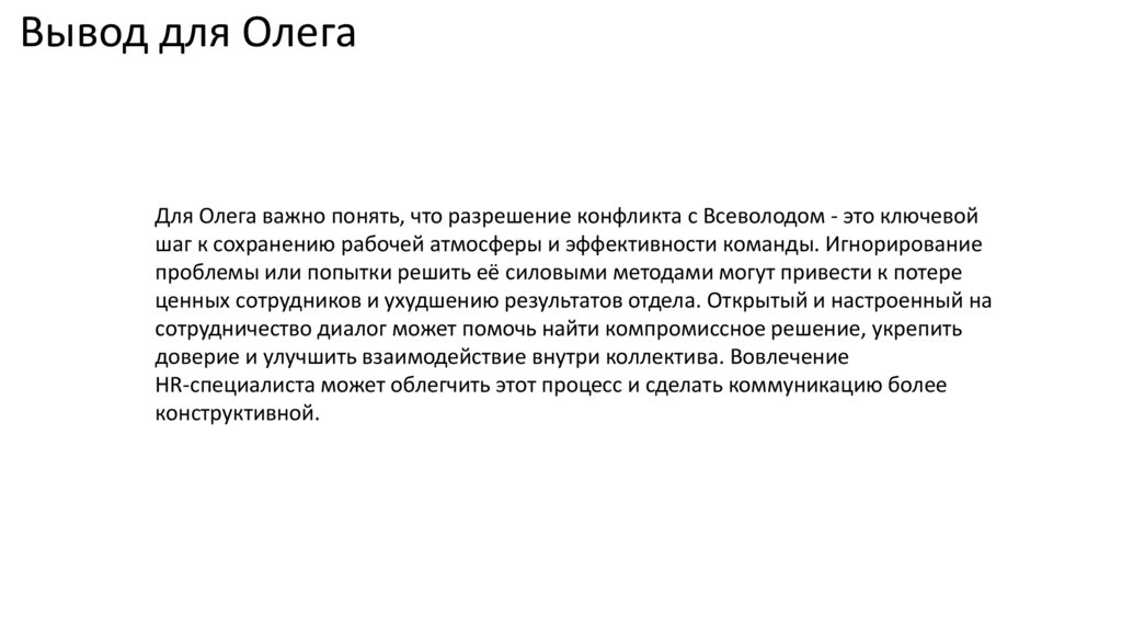 Вывод для ОлегаДля Олега важно понять, что разрешение конфликта с Всеволодом - это ключевой