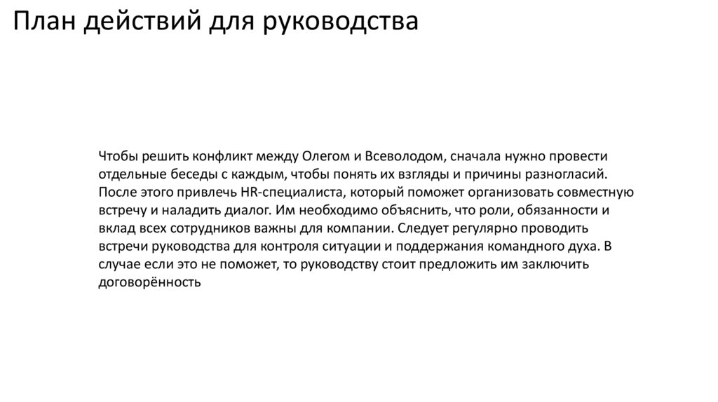 План действий для руководстваЧтобы решить конфликт между Олегом и Всеволодом, сначала нужно провести
