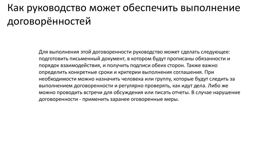 выполнением договоренности и регулярно проверять, как идут дела. Либо же