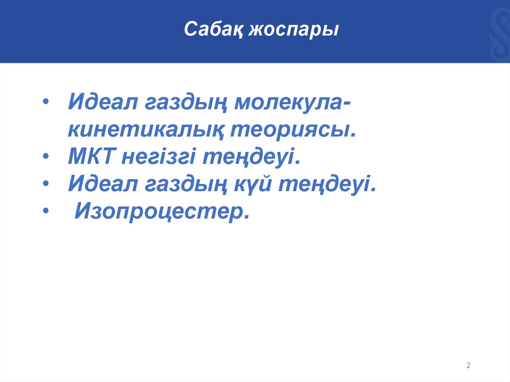 Сабақ жоспары• Идеал газдың молекулакинетикалық теориясы.