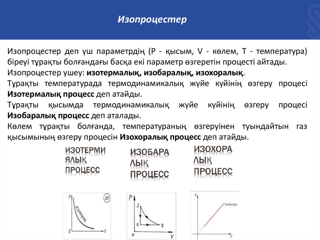 ИзопроцестерИзопроцестер деп үш параметрдің (Р - қысым, V - көлем, Т - температура)