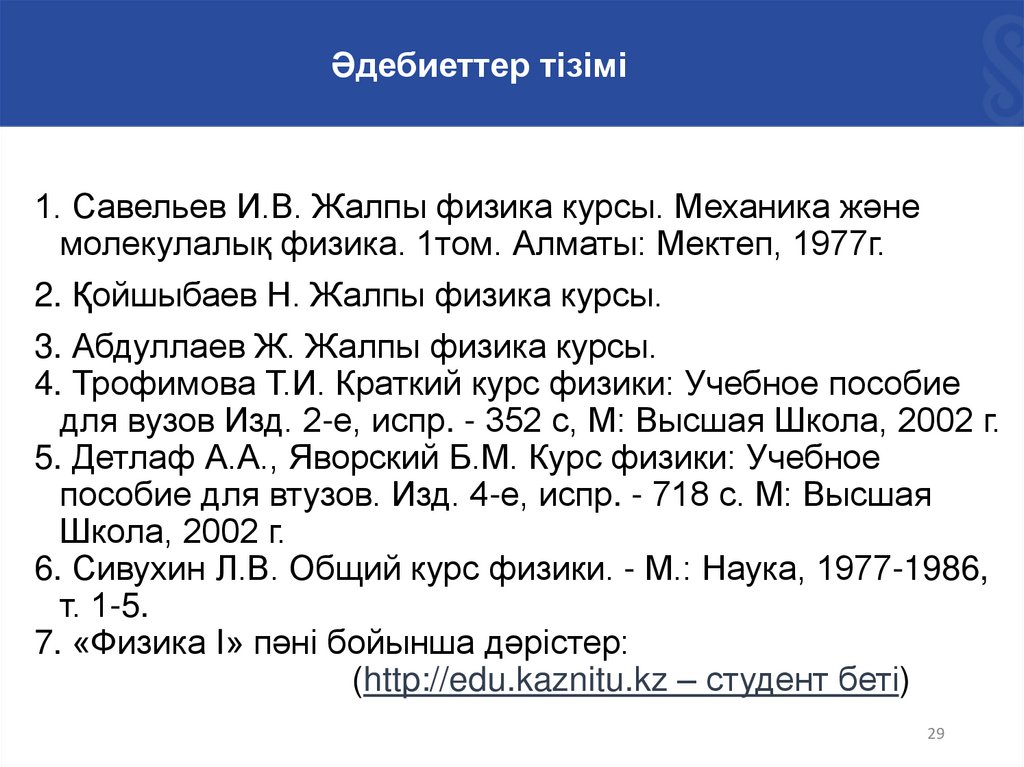 Әдебиеттер тізімі1. Савельев И.В. Жалпы физика курсы. Механика және