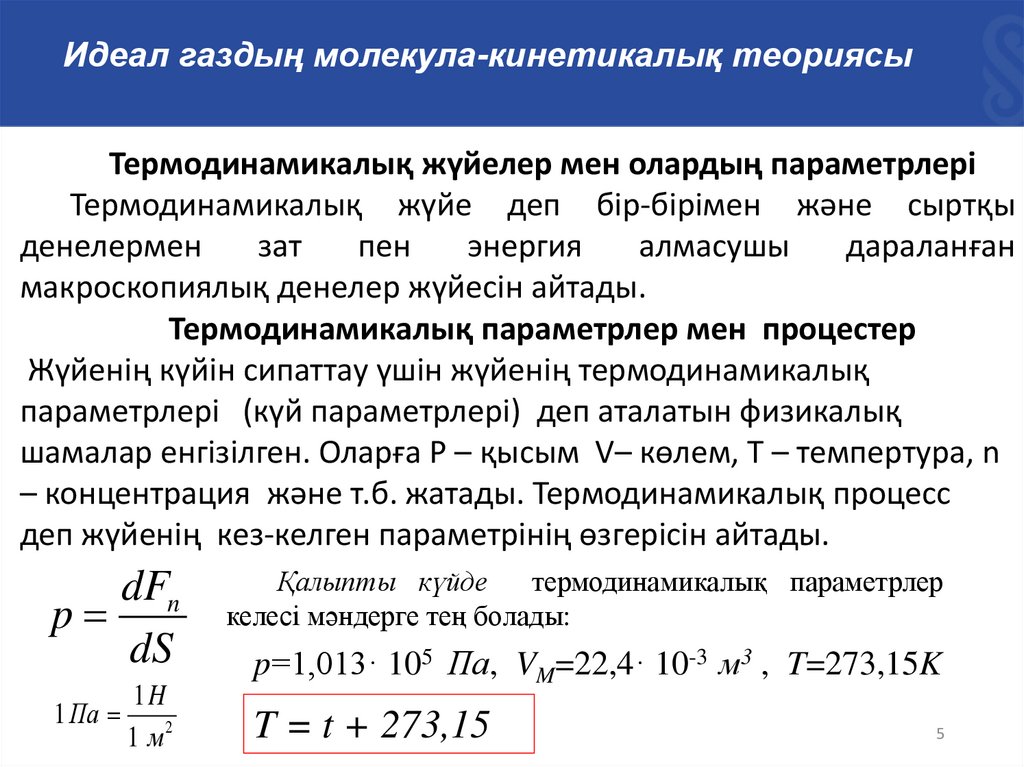 Идеал газдың молекула-кинетикалық теориясыТермодинамикалық жүйелер мен олардың параметрлері