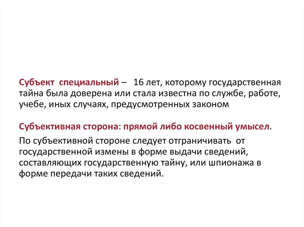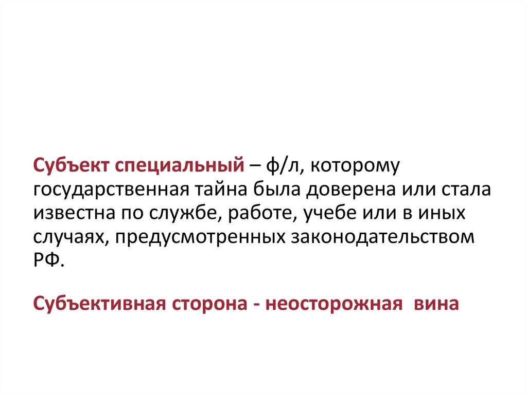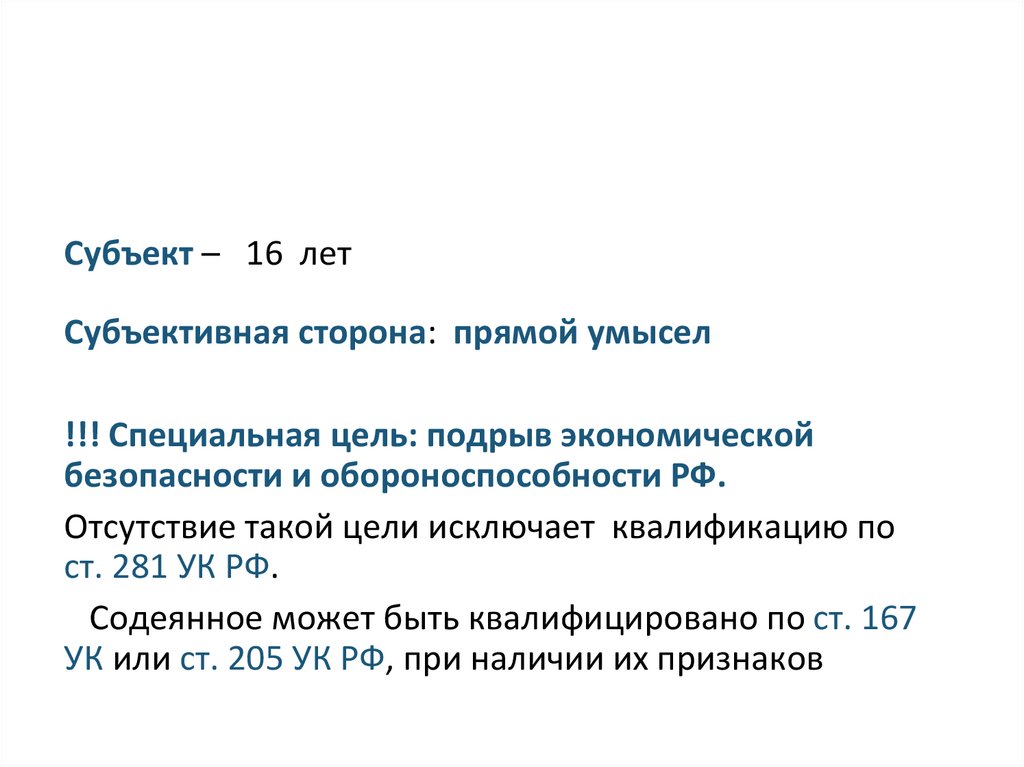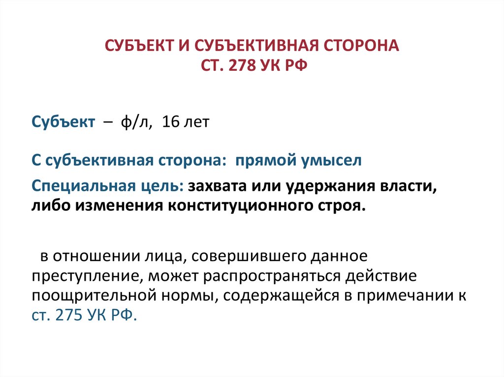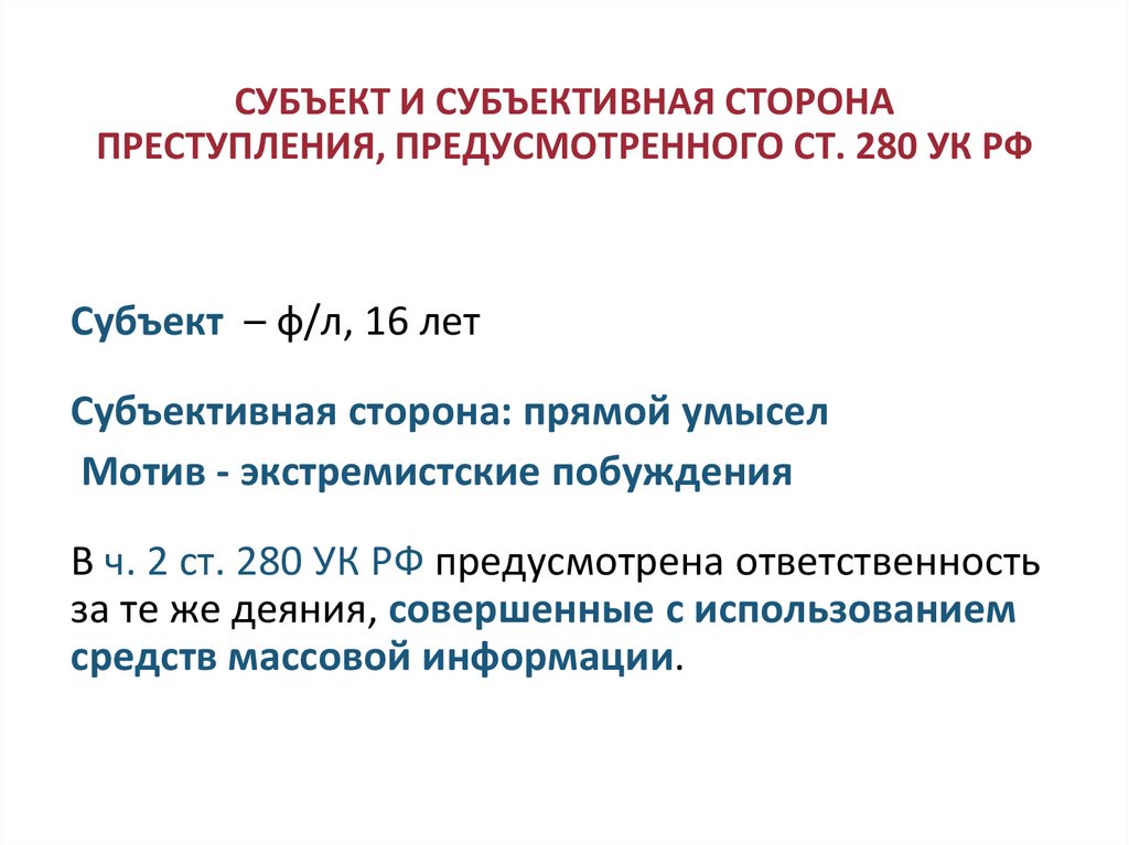 СУБЪЕКТ И СУБЪЕКТИВНАЯ СТОРОНАПРЕСТУПЛЕНИЯ, ПРЕДУСМОТРЕННОГО СТ. 280 УК РФ