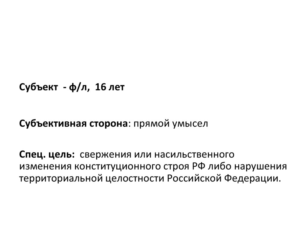 Субъект - ф/л, 16 летСубъективная сторона: прямой умысел