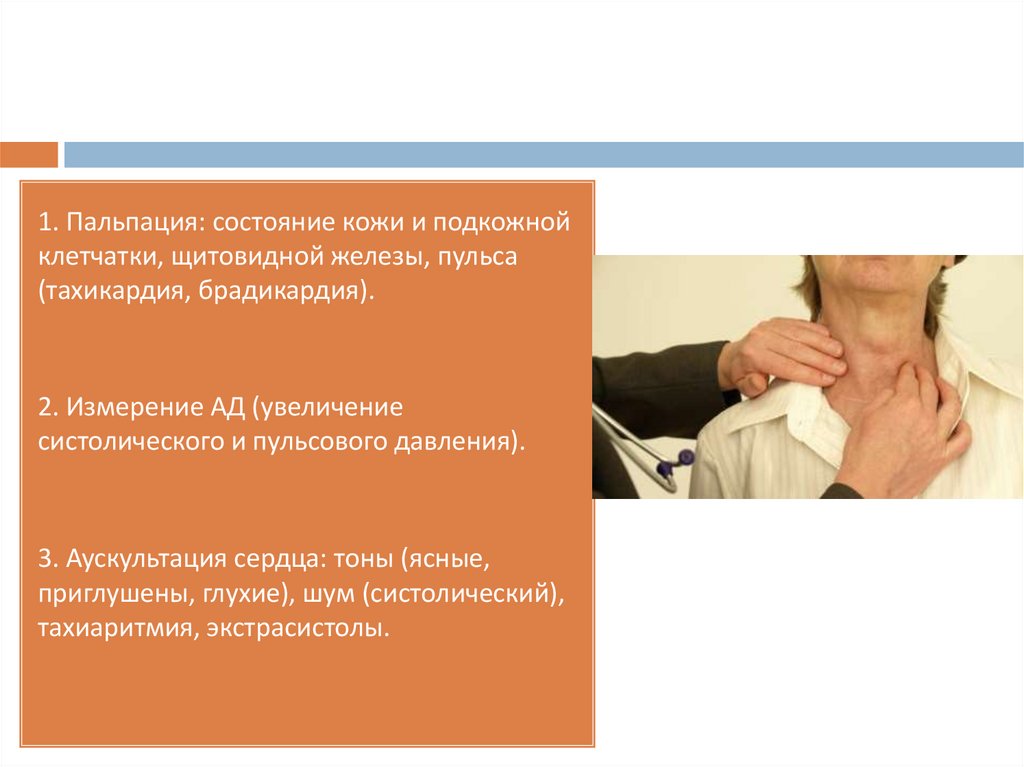1. Пальпация: состояние кожи и подкожнойклетчатки, щитовидной железы, пульса