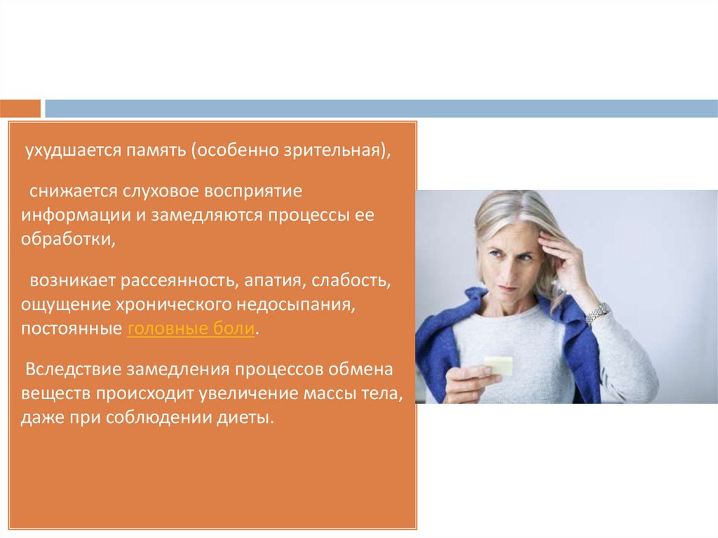 ухудшается память (особенно зрительная),снижается слуховое восприятие