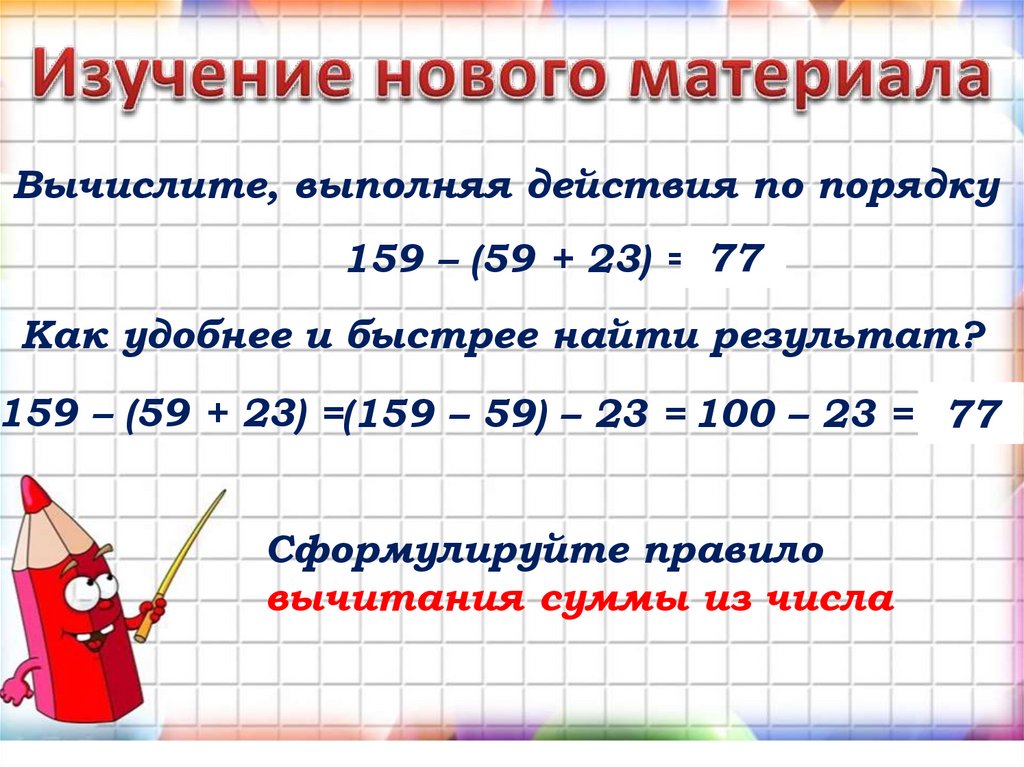 Вычислите, выполняя действия по порядку159 – (59 + 23) = 77