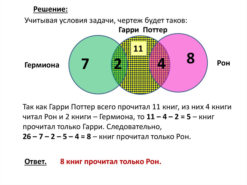 читал Рон и 2 книги – Гермиона, то 11 – 4 – 2 = 5 – книг