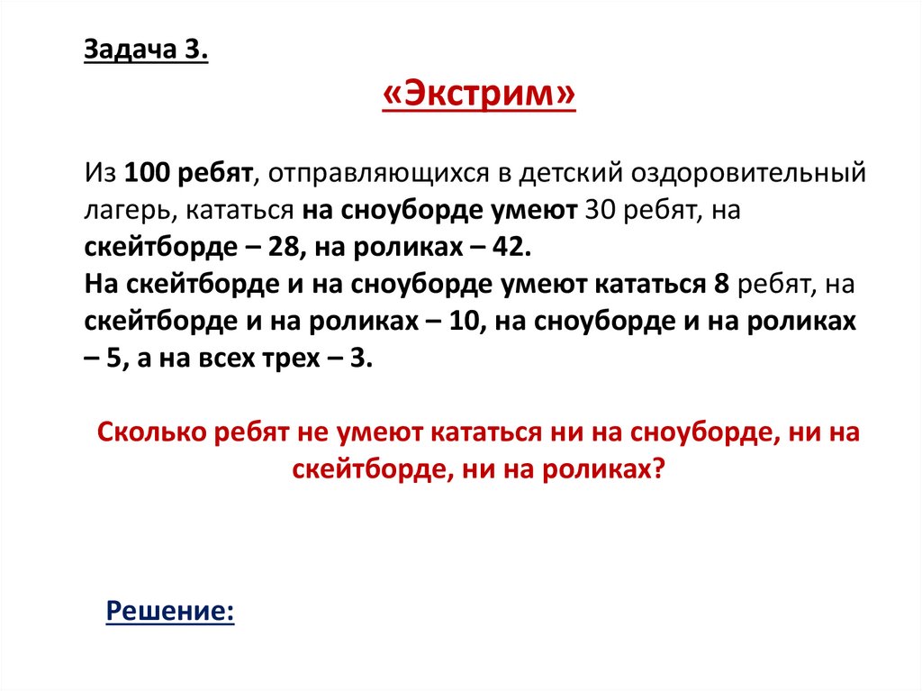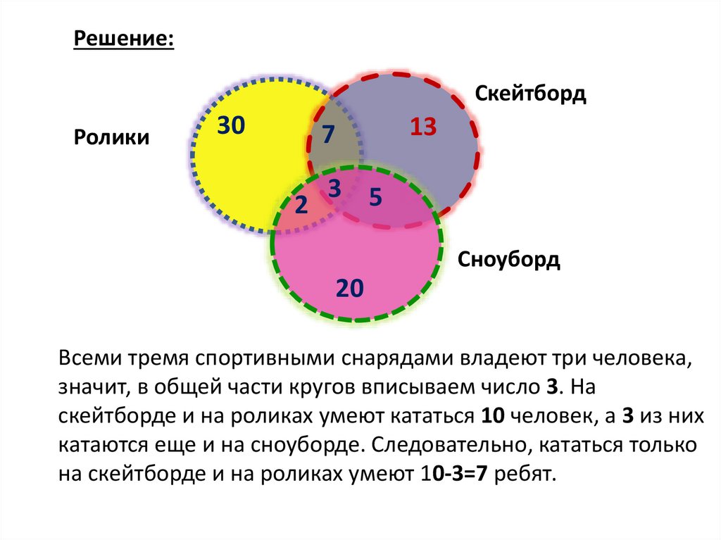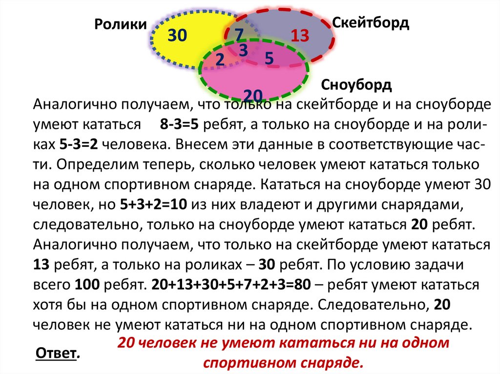 следовательно, только на сноуборде умеют кататься 20 ребят.