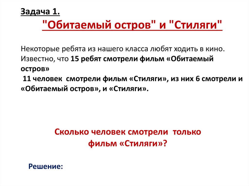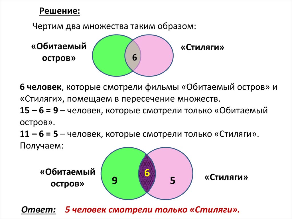 11 – 6 = 5 – человек, которые смотрели только «Стиляги».