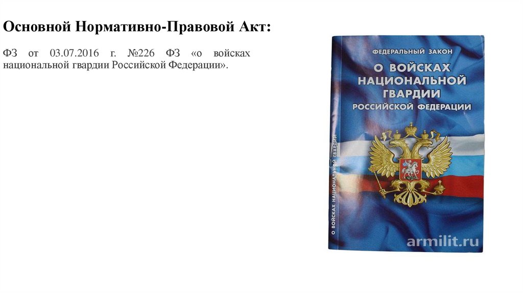 Основной Нормативно-Правовой Акт:ФЗ от 03.07.2016 г. №226 ФЗ «о войсках